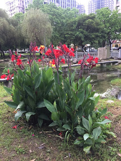 新竹縣竹北市康乃爾小學旁公園河堤上,各種花爭豔怒放,讓沿著河堤散步、慢跑、的民眾,看了心曠神怡!